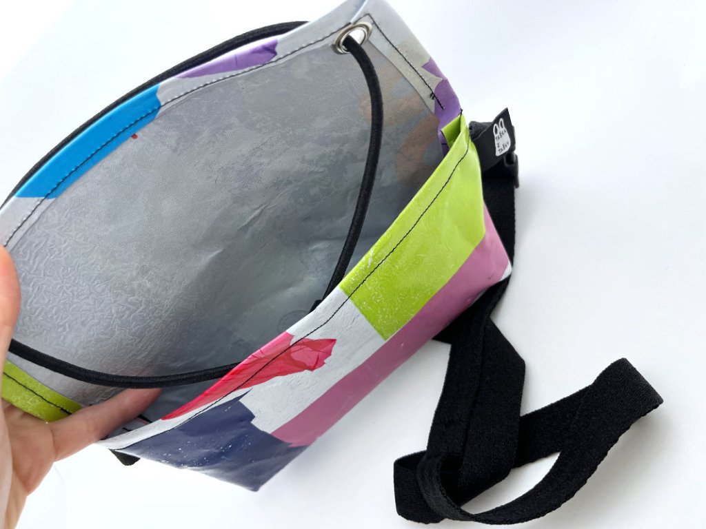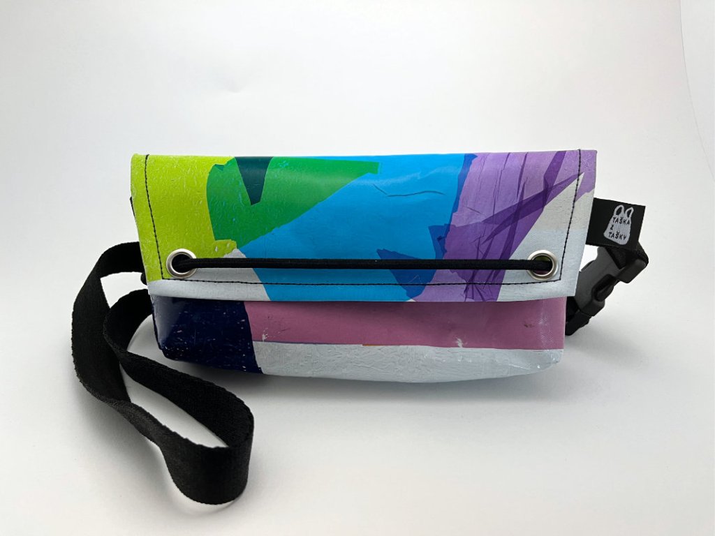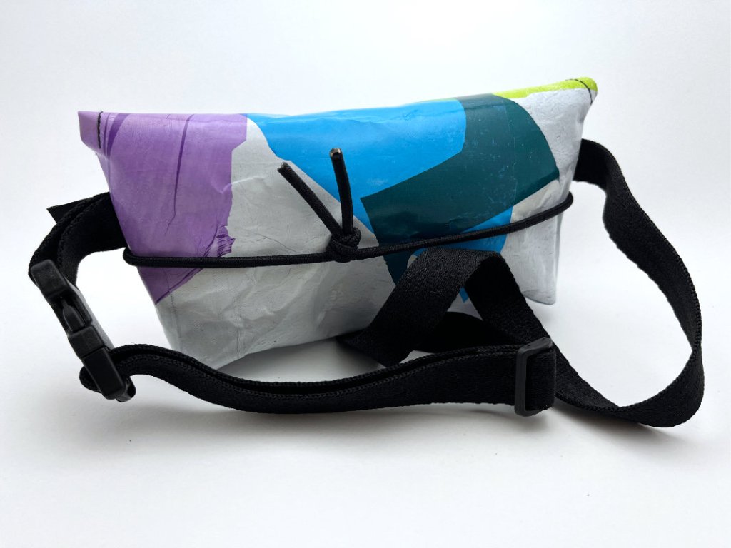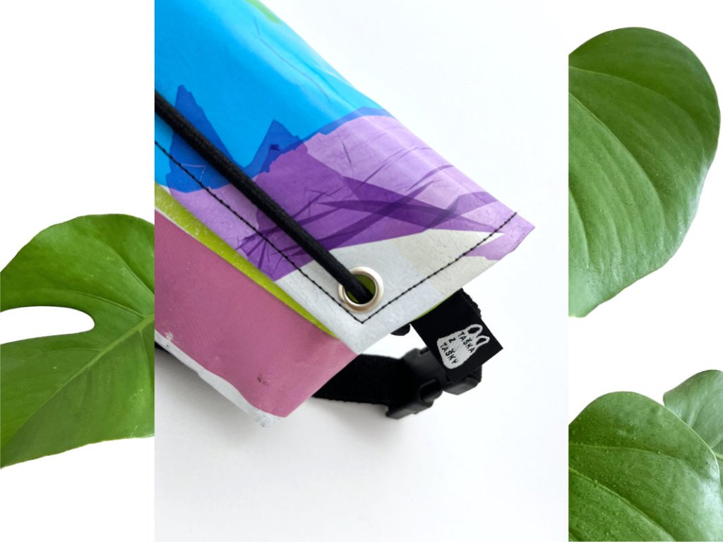 Na výrobu ledvinky bylo použito 5-6 vrstev igelitových tašek. Guma a nastavitelný popruh jsou vyrobeny z recyklovaného polyamidového vlákna Econyl®, které je vyráběno z odpadního nylonu (zbytky z výroby, staré oblečení, rybářské sítě, koberce...).Zmíněný odpad prochází regenerací a vytváří se z něj nové, čisté nylonové vlákno. Tento proces je opakovatelný a takto vyrobený nylon se dá opět recyklovat. Přezky a posunovač jsou z recyklovaného plastu od německého výrobce.