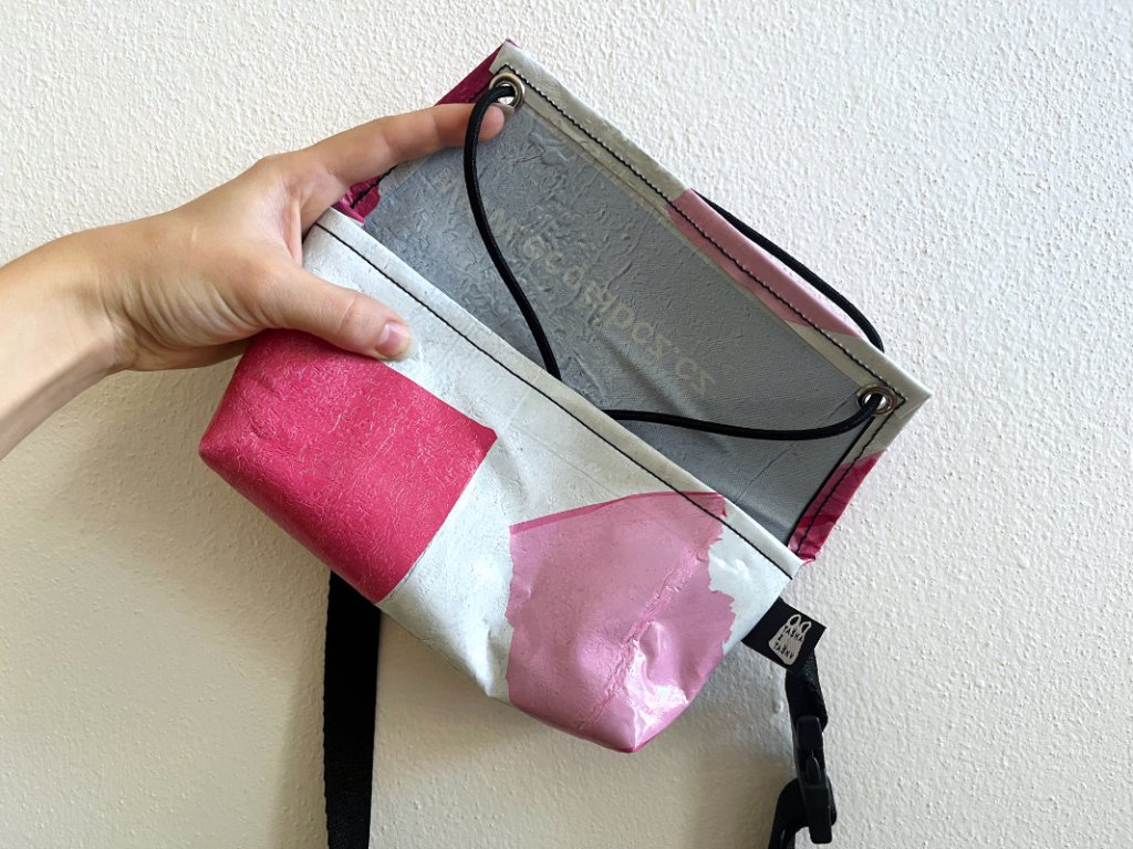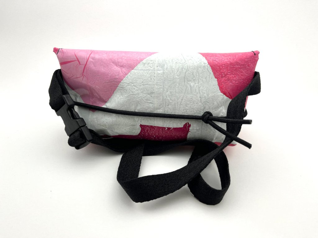 Na výrobu ledvinky bylo použito 5-6 vrstev igelitových tašek. Guma a nastavitelný popruh jsou vyrobeny z recyklovaného polyamidového vlákna Econyl®, které je vyráběno z odpadního nylonu (zbytky z výroby, staré oblečení, rybářské sítě, koberce...).Zmíněný odpad prochází regenerací a vytváří se z něj nové, čisté nylonové vlákno. Tento proces je opakovatelný a takto vyrobený nylon se dá opět recyklovat. Přezky a posunovač jsou z recyklovaného plastu od německého výrobce.