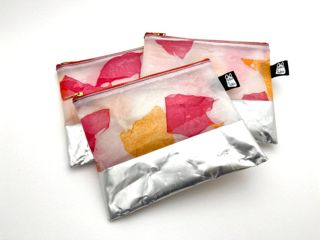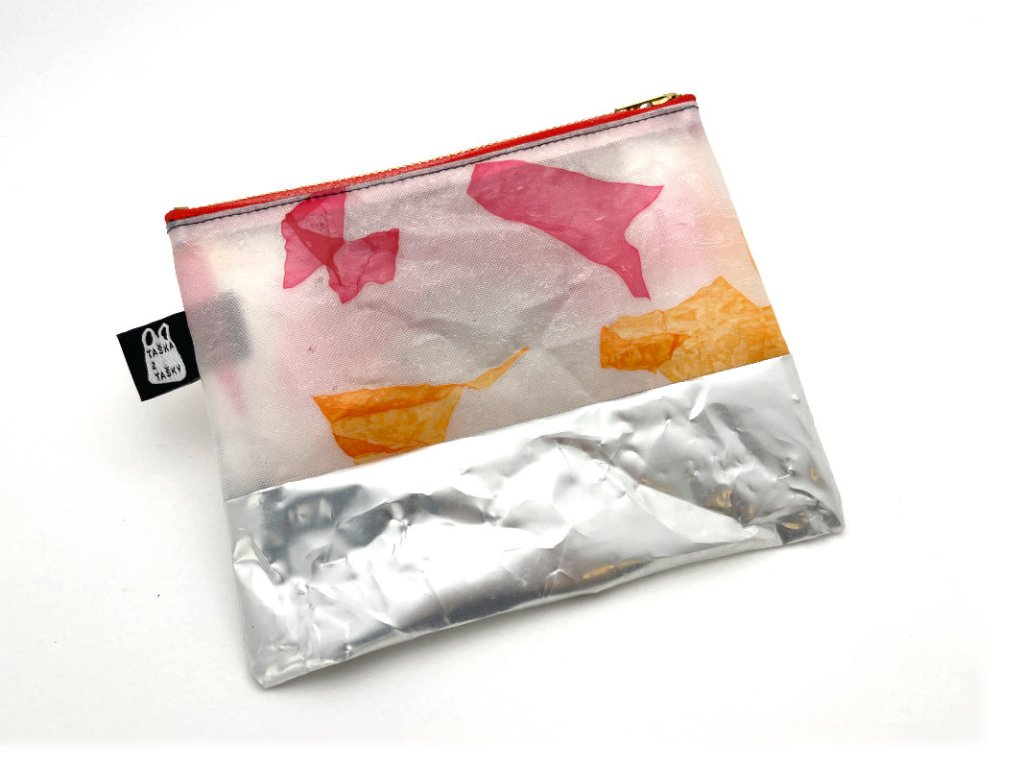 Je vyrobená ze 4-5 vrstev upcyclovaných igelitek. Stříbrná část je z obalu od kávy, nebo krmiva pro psy.