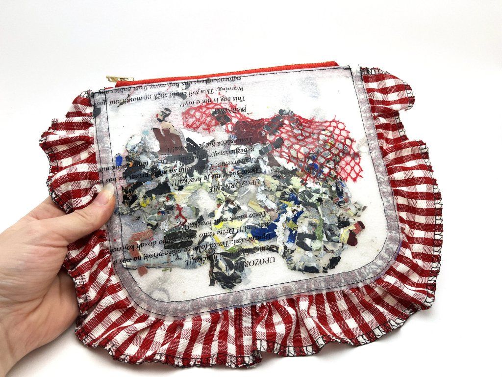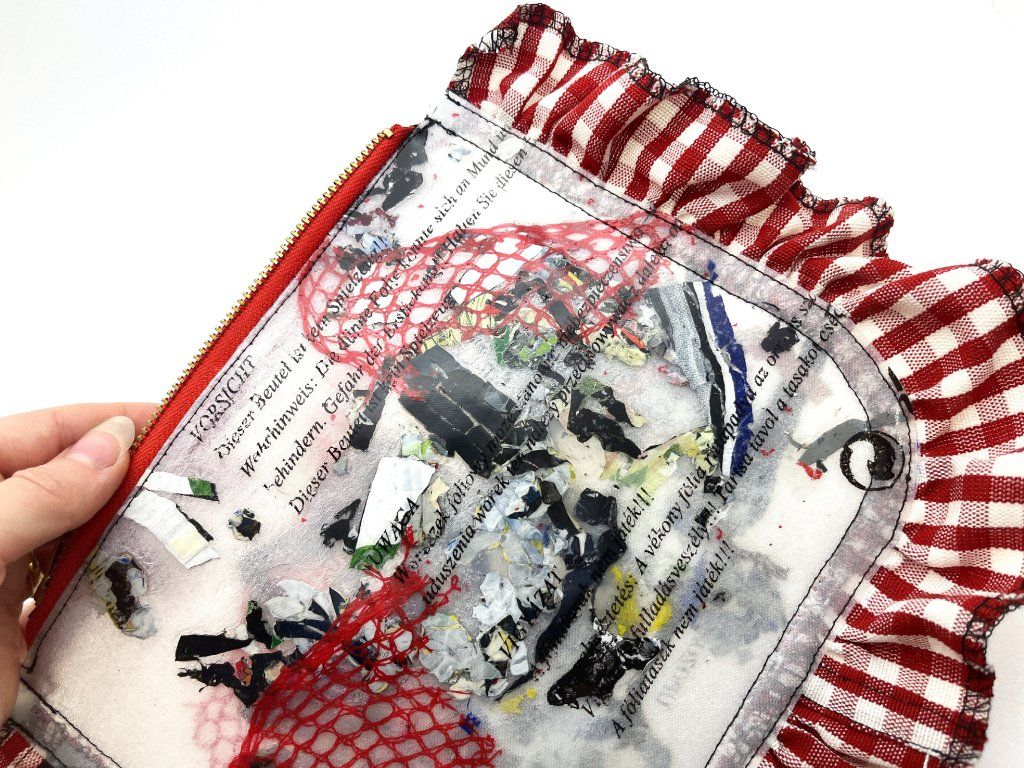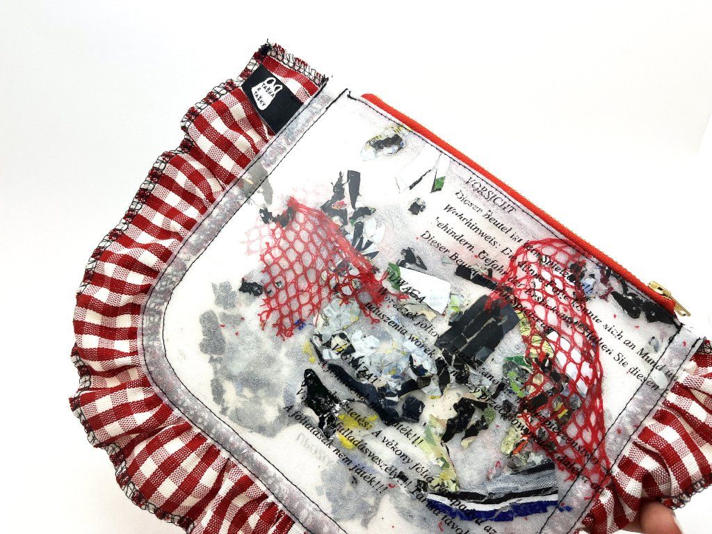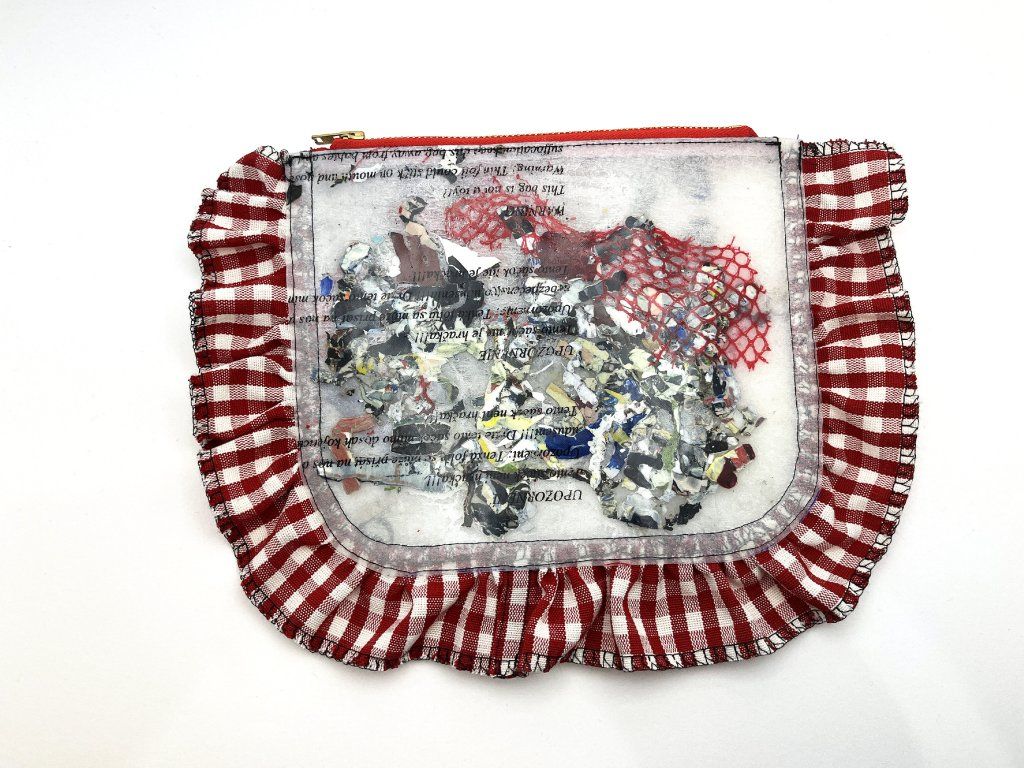 Upcyclovaná taštička z igelitek a deadstokového textilu